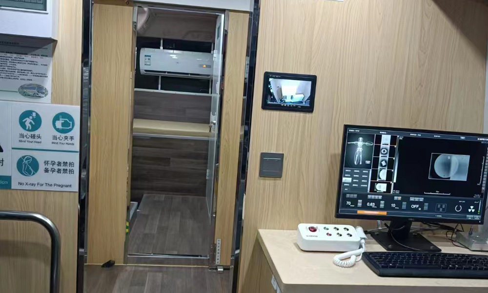 粤海新推出一款7米高性价的职业病体检车;主要的特点就是把车载DR和电测听室融入到7米的车内;我们都是知道以往一辆车要带车载DR和电测听室少是需要8米的;瑞骏根据区域划分;将空间紧密利用起来;相比8米车少能为体检中心少了10万左右成本; 我们将电测听室放在车里后门上去位置;可以把放射和电测听受检分开;后门的听力;中门是放射;两边分区不耽误;后门还设置两个折叠座椅;可以给受检者等候是坐着;